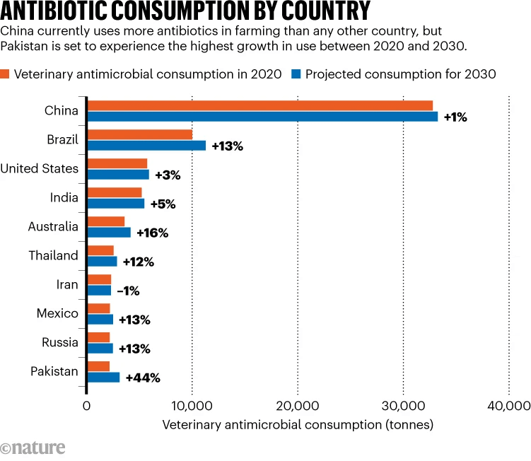 El equipo calculó que el uso de antibióticos en África es probablemente el doble de lo que informa WOAH, y el uso en Asia es un 50% más alto de lo informado. Los autores atribuyen esto al hecho de que muchos países de estas regiones no responden a las encuestas WOAH. Teniendo esto en cuenta en sus cálculos, los autores estiman que para 2030, el mundo utilizará alrededor de 107 500 toneladas de antibióticos en el ganado por año, en comparación con poco menos de 100 000 toneladas en 2020. El uso de antibióticos es más alto en Asia, y China en particular (ver ‘Consumo de antibióticos por país’), una tendencia que se espera que continúe hasta 2030. Los investigadores también estiman que el uso de antibióticos crecerá más rápido en África, aumentando un 25 % entre 2020 y 2030 debido a la mayor demanda de productos cárnicos.