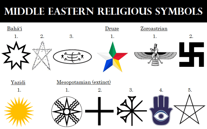 Las religiones ahora se presentan geográficamente, comenzando con el Medio Oriente. Dos de estos se consideran abrahámicos (bahá’í y drusos) pero son más pequeños que los tres grandes.