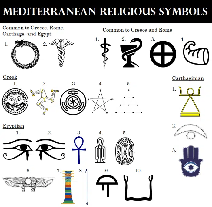 Incluso con la definición limitada de simbolismo religioso proporcionada al comienzo de este artículo, se pueden identificar cientos, originarios de docenas de culturas de casi todas las épocas históricas y continentes del mundo.