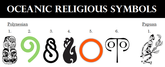 Esta categoría incluye símbolos religiosos de Oceanía. Actualmente, las únicas entradas son polinesias (principalmente maoríes de Nueva Zelanda) y papúes. Muchas religiones indígenas se basan en la naturaleza (o están extinguidas), lo que hace que los símbolos abstractos sean innecesarios.