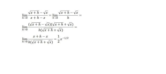 Observe que lo anterior requería racionalizar el numerador. Esto es lo contrario de lo que normalmente se hace en álgebra. La principal dificultad en todo el cálculo es pensar fuera de la caja del álgebra. Las técnicas de cálculo no son tan difíciles.