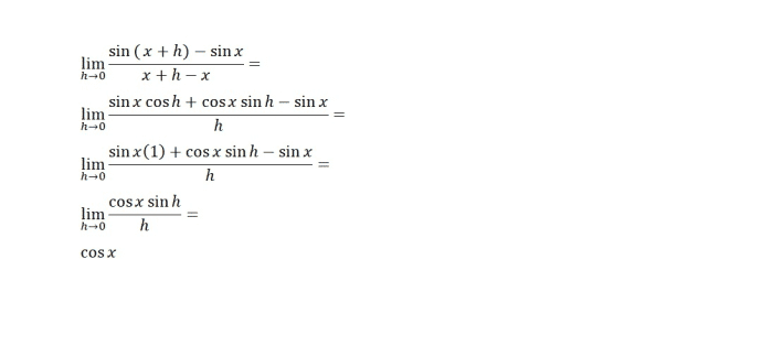 Una fórmula diferente es la fórmula para la derivada de sin( x ), que es cos( x ). Esto se muestra fácilmente usando la fórmula del seno de la suma de dos ángulos.