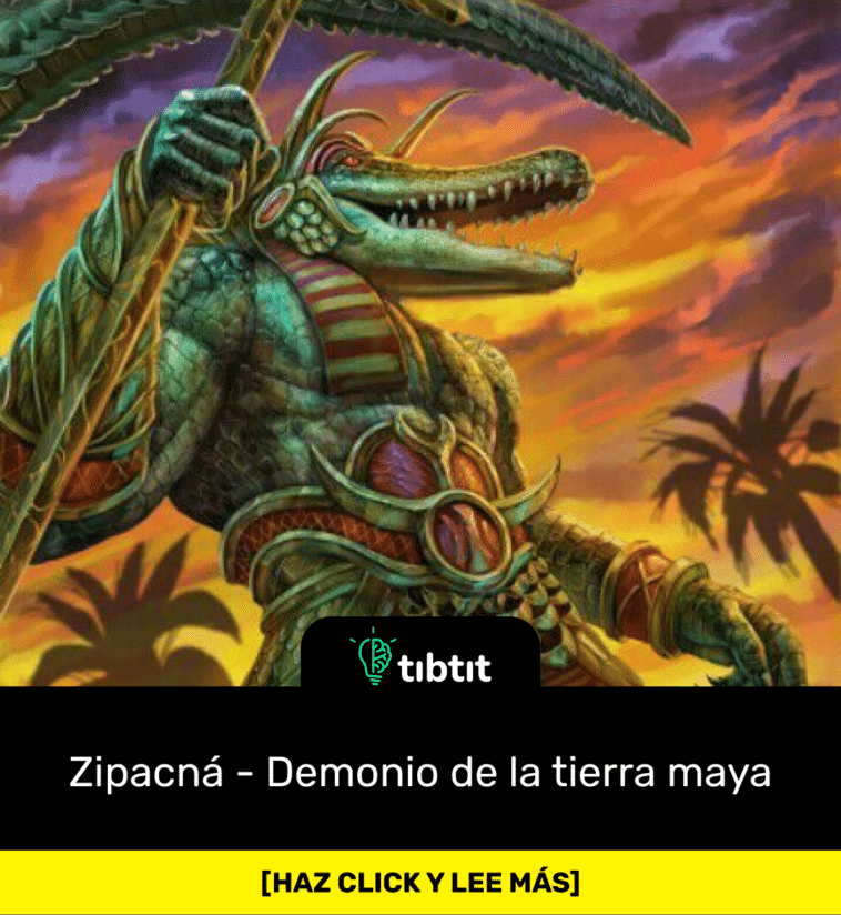 Zipacná era respetado como el dios demoníaco de la corteza terrestre, lo que demuestra que los mayas al menos tenían un conocimiento básico de nuestro planeta. Zipacna vive en lo profundo de las montañas, donde espera a viajeros solitarios a los que puede asesinar por diversión. Los dioses odiaban a los demonios porque los impulsaba la pura maldad. Pero los dioses odiaron especialmente a Zipacná por su excesiva crueldad.